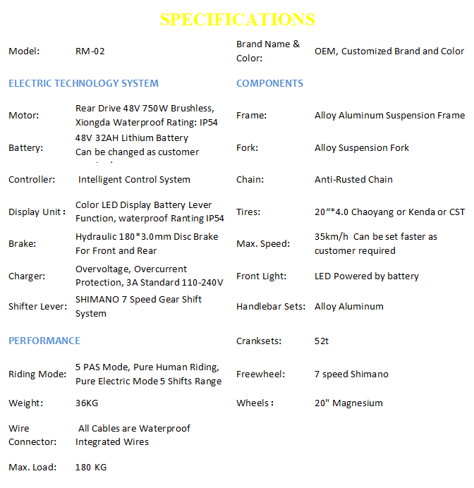 Alloy Aluminum Suspension Frame, 48V 32AH Lithium Battery,Intelligent Control System, Hydraulic 180*3.0mm Disc Brake For Front And Rear, SHIMANO 7 Speed Gear Shift System, Color LED Display Battery Lever Function