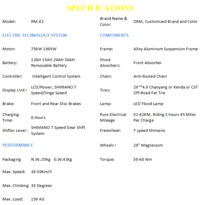 750W 1000W Mountain Electric Bike, 12AH 15AH 20AH Removable Lithium Battery, SHIMANO 7 Speed or Single Speed, Front and Rear Disc Brake, LCD Power Display, 20inch *4.0 CHAOYANG Or KENDA Off-Road Fat Tire Ebike